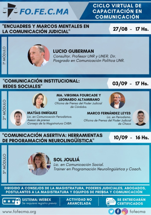 El Foro Federal de Consejos de la Magistratura y Jurados de Enjuiciamiento de la República Argentina (FOFECMA) invita al Ciclo Virtual de Capacitación en Comunicación, a realizarse a partir del 27 de agosto de 2020. El ciclo cuenta con 3 módulos, que se pueden cursar independientemente, y es de acceso libre y gratuito, previa inscripción.…