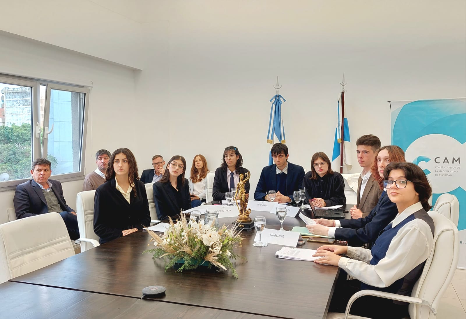 En el caso de Tucumán, el rol de nuestros estudiantes fue el del tribunal del juicio, compuesto por jueces/juezas y secretarios/as, quienes iniciaron la audiencia, explicaron a las partes y al jurado sus derechos y obligaciones y, para cerrar, recibieron el veredicto del jurado e impartieron la pena considerada por el tribunal. Para ello, se realizaron desde el CAM charlas previas con los estudiantes a fin de ponerlos en contexto sobre el rol del Consejo en la selección de los jueces y brindarles asesoramiento acerca del marco legal y de las funciones de los magistrados.