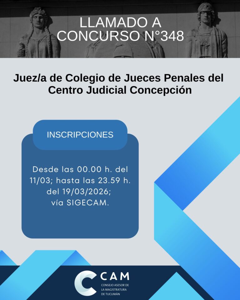 El Consejo Asesor de la Magistratura de Tucumán llama a concurso público para Juez/a de Colegio de Jueces Penales del Centro Judicial Concepción Convocado por Acuerdo n°01/2026 de fecha 25/02/2026. PLAZO PARA LA INSCRIPCIÓN EN LÍNEA: desde las 00:00 horas del 11/03;…