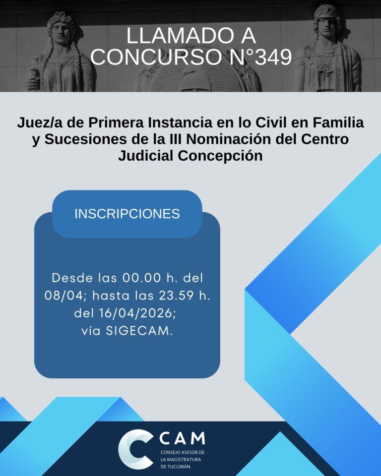 El Consejo Asesor de la Magistratura de Tucumán llama a concurso público para Juez/a de Primera Instancia en lo Civil en Familia y Sucesiones de la III Nominación del Centro Judicial Concepción Convocado por Acuerdo n°03/2026 de fecha 25/03/2026. …