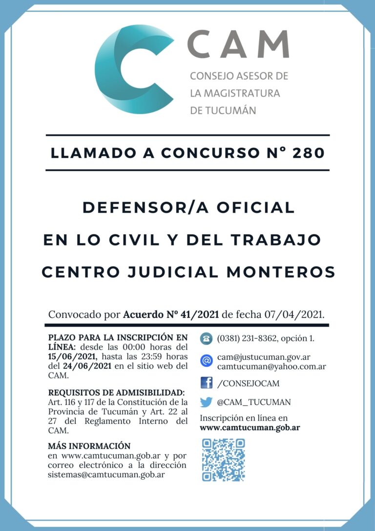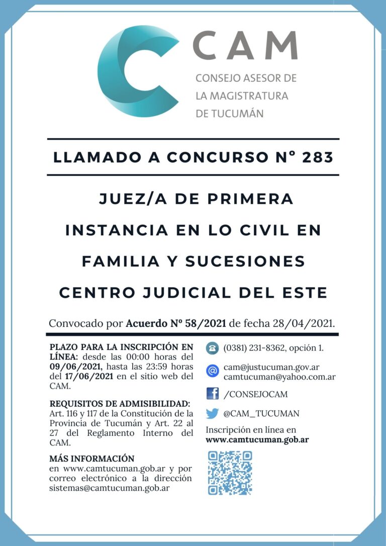 El Consejo Asesor de la Magistratura de Tucumán llama a concurso público para Juez/a de Primera Instancia en lo Civil en Familia y Sucesiones de la II Nominación del Centro Judicial Monteros Convocado por Acuerdo Nº 114/2021 de fecha 01/09/2021. PLAZO…