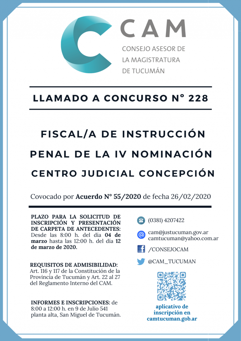 El Consejo Asesor de la Magistratura de Tucumán llama a concurso público para JUEZ/A DE PRIMERA INSTANCIA EN LO CONTENCIOSO ADMINISTRATIVO CENTRO JUDICIAL CAPITAL Convocado por Acuerdo N° 57/2020 de fecha 26/02/2020 PLAZO PARA LA SOLICITUD DE INSCRIPCIÓN Y…