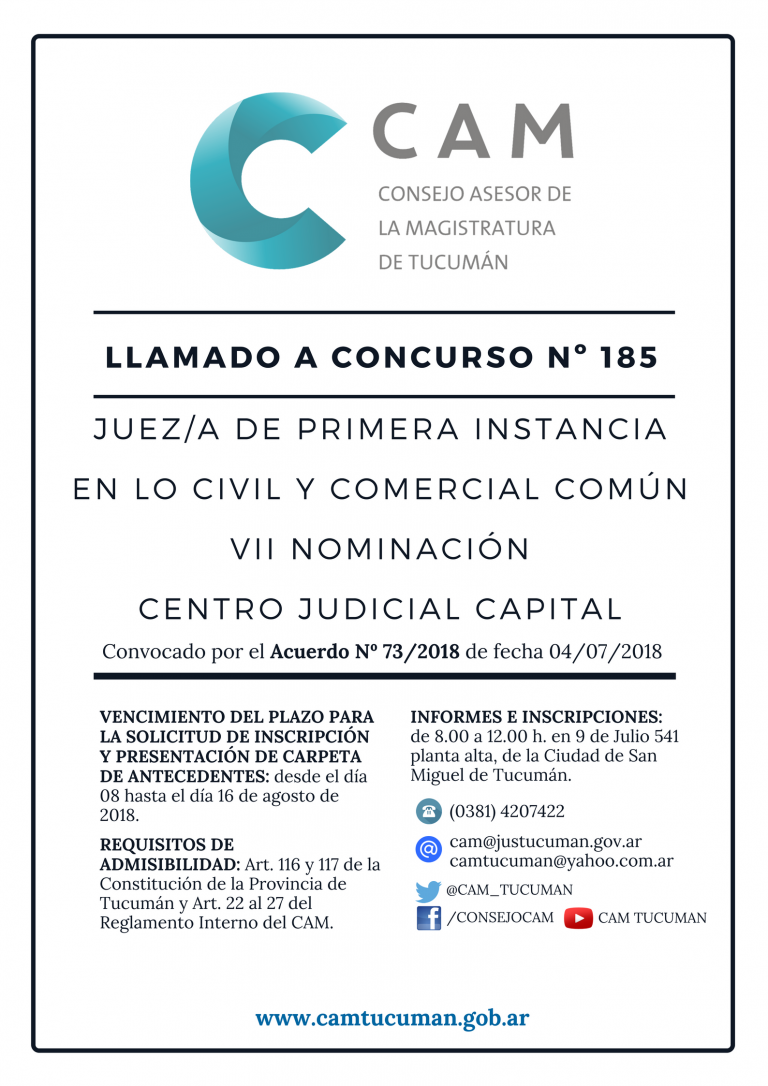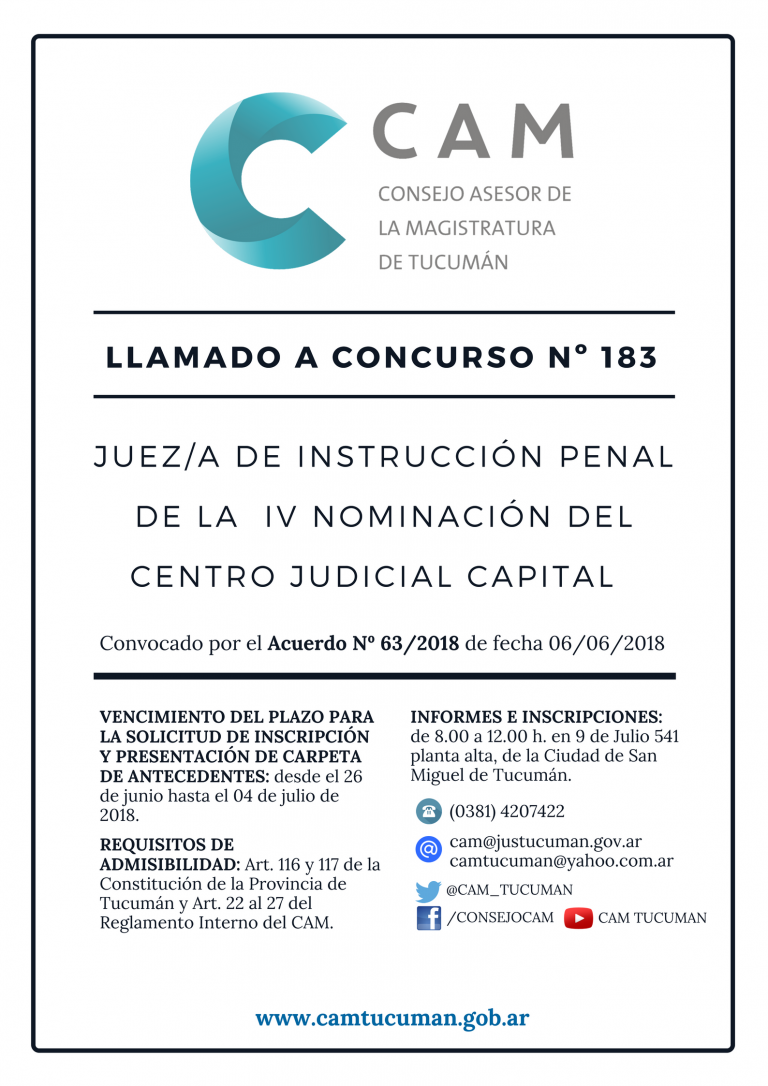 El Consejo Asesor de la Magistratura de Tucumán llama a Concurso Público de Antecedentes y Aposición para Juez/a Correccional en lo Penal de la II Nominación Centro Judicial Capital Convocado por el Acuerdo N° 90/2018 de fecha 31/07/2018 VENCIMIENTO…