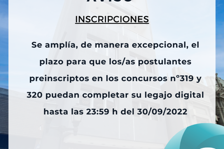 Se amplía, de manera excepcional, el plazo para que los/as postulantes preinscriptos en los concursos nº319 (Fiscal/a civil, Comercial y Laboral de la II Nominación del Centro Judicial Capital) y 320 (Juez/a del Colegio de Jueces Penales del Centro Judicial Capital) puedan completar su legajo digital hasta las 23:59 h del 30/09/2022, por Resolución nº327/2022.