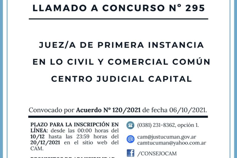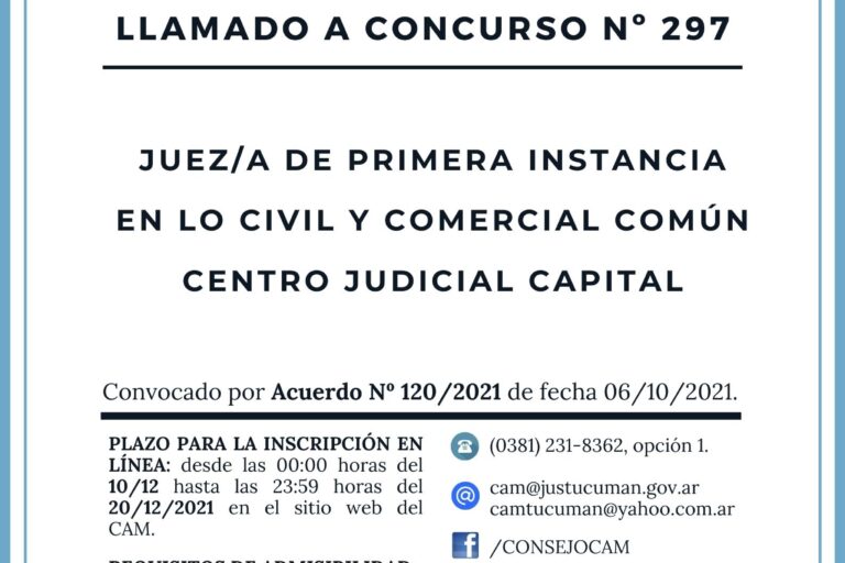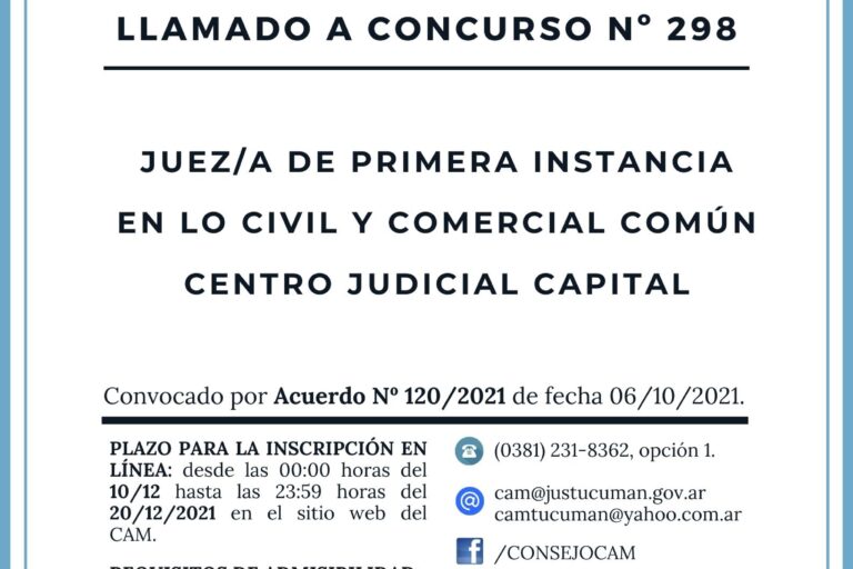 El Consejo Asesor de la Magistratura de Tucumán llama a concurso público para Juez/a de Primera Instancia en lo Civil y Comercial Común Centro Judicial Capital Convocado por Acuerdo Nº 120/2021 de fecha 06/10/2021. PLAZO PARA LA INSCRIPCIÓN EN LÍNEA: desde las 00:00 horas del 10/12 hasta las 23:59 horas del 20/12/2021, en el sitio…
