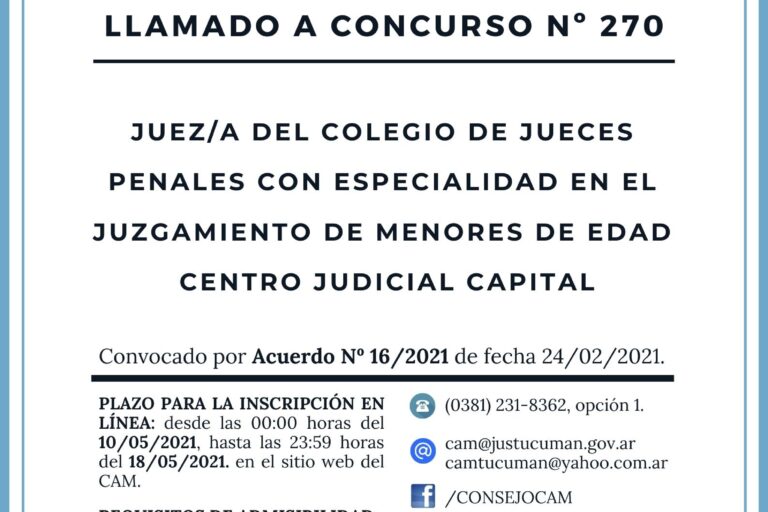 El Consejo Asesor de la Magistratura de Tucumán llama a concurso público para Juez/a del Colegio de Jueces Penales con especialidad en el juzgamiento de menores de edad, del Centro Judicial Capital Convocado por Acuerdo Nº 16/2021 de fecha 24/02/2021. PLAZO PARA LA INSCRIPCIÓN EN LÍNEA: desde las 00:00 horas del 10/05/2021, hasta las 23:59 horas…