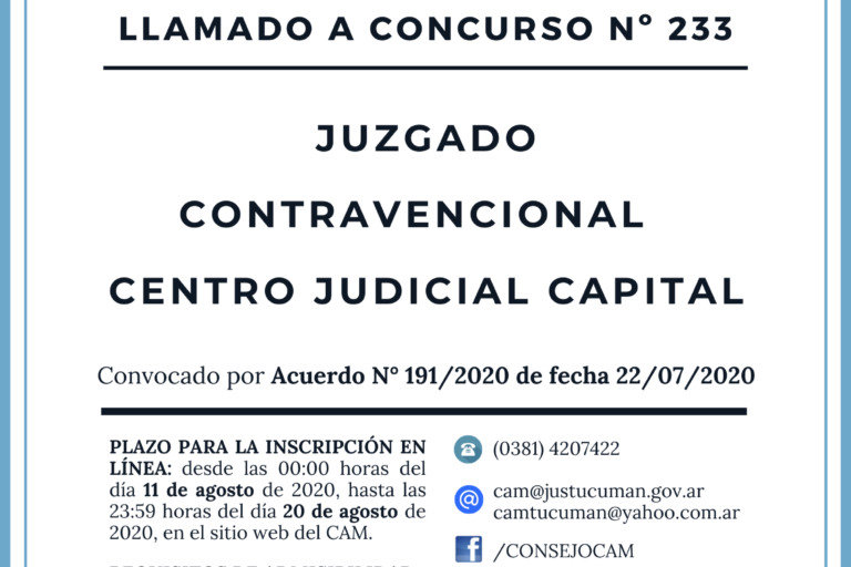 El Consejo Asesor de la Magistratura de Tucumán llama a concurso público para JUEZ/A CONTRAVENCIONAL CENTRO JUDICIAL CAPITAL Convocado por Acuerdo N° 191/2020 de fecha 22/07/2020 PLAZO PARA LA INSCRIPCIÓN EN LÍNEA: desde las 00:00 horas del día 11 de agosto de 2020, hasta las 23:59 horas del día 20 de agosto de 2020, en…