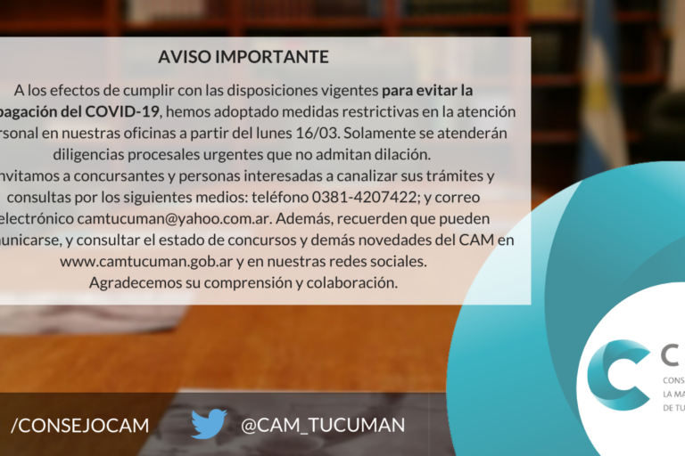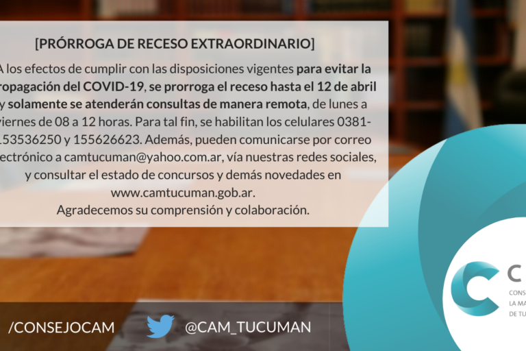 Por razones sanitarias, se prorroga el receso administrativo para el CAM desde el día 11 de mayo hasta el día 17 de mayo de 2020, inclusive. La decisión se tomó por Resolución de Presidencia número 67/2020 de fecha 10 de mayo de 2020, considerando la situación sanitaria de público conocimiento dada por el Covid-19, las…
