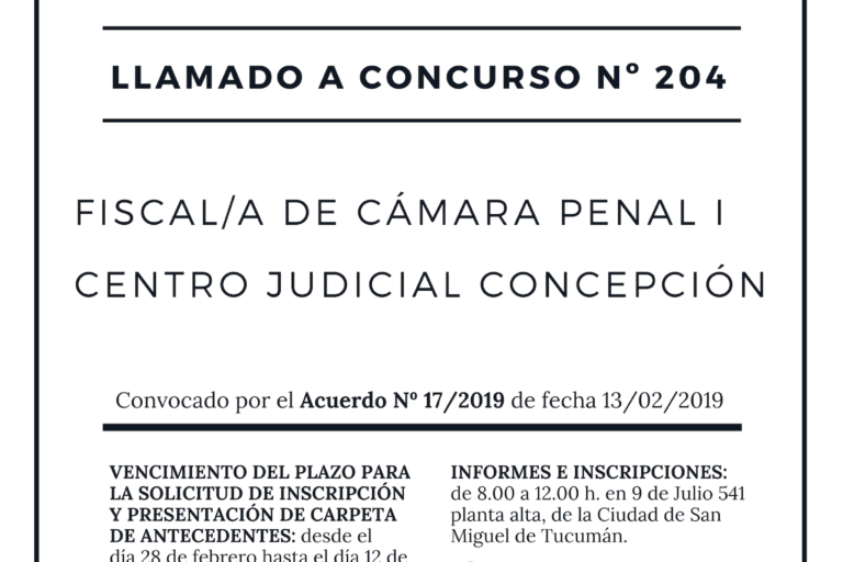 El Consejo Asesor de la Magistratura de Tucumán llama a concurso público para FISCAL/A DE CÁMARA PENAL I CENTRO JUDICIAL CONCEPCIÓN Convocado por el el Acuerdo N°17/2019 de fecha 13/02/2019. VENCIMIENTO DEL PLAZO PARA LA SOLICITUD DE INSCRIPCIÓN Y PRESENTACIÓN DE CARPETA DE ANTECEDENTES: desde el día 28 de febrero hasta el día 12 de marzo (inclusive)…